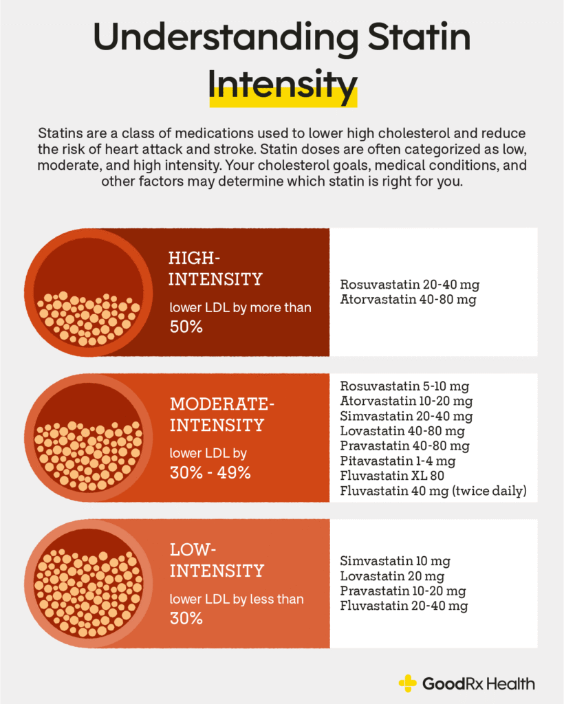 Statins lower the level of ‘bad’ cholesterol (known as low-density lipoprotein or LDL) in your blood. LDL cholesterol can build up in your blood vessels and block the blood flow to your heart or brain, leading to a heart attack or stroke.