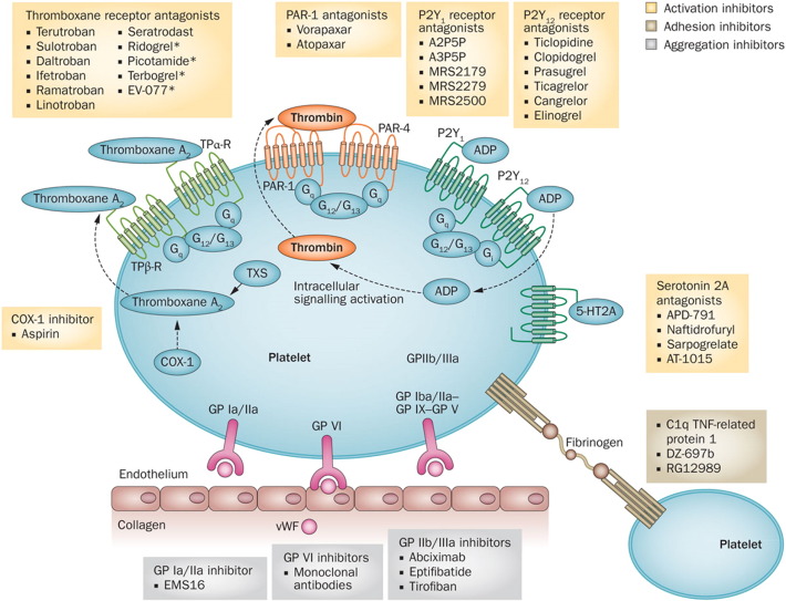 Glycoprotein IIb/IIIa (GP IIb/IIIa) inhibitors prevent platelet aggregation by blocking glycoprotein IIb/IIIa receptors on their platelet’s plasma membrane and inhibiting fibrinogen binding. The available GP IIb/IIIa inhibitors include tirofiban and eptifibatide.